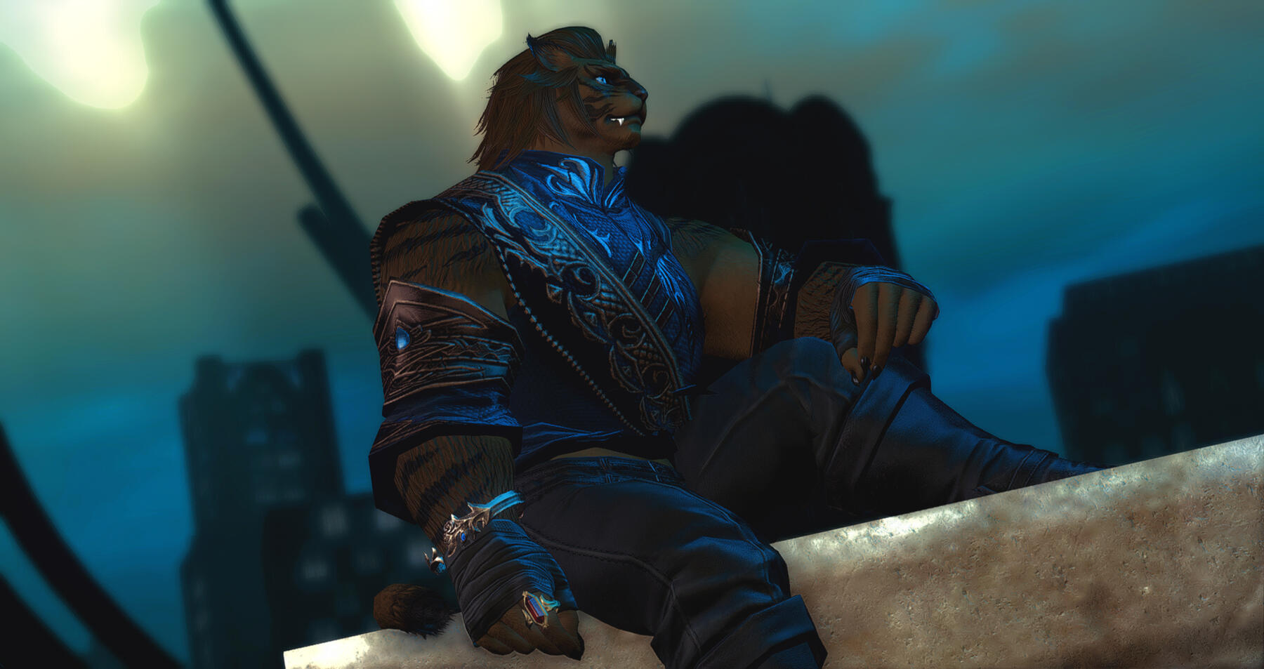 Hooks-Sven is an extremely talented blacksmith and armourer, learning and excelling in the crafts upon landing in Limsa. Need to complete a commission? In search of your dream armor, but unsure of where to start? He comes highly recommended from both Guildmasters, and has assorted flyers posted among the various city states.-Given his lineage and physical attributes, Sven excels at hunting! He has led multiple commission parties through dangerous territories in search of rare marks, always letting his client land the killing blow. He even assists the gleaners of Old Sharlayan should they need a particularly difficult to obtain specimen, meeting his deadlines no matter the obstacle, and always delivering his prey with a bright smile. Searching for something to put on your wall? In need of some fresh, hard to find meat for a new dish you're preparing? Eager to experience the thrill of the hunt without unnecessary danger? He advertises through the grand companies in Ul'dah, Limsa Lominsa, and Sharlayan, and shouldn't be too hard to find.-If you meet him early in his backstory, before he's driven from Tulliyolal, you can find him serving as a bouncer at a club! He's used to dealing with drunk patrons, so rest assured, you'd be in good hands should you bump into him and need an eager and attentive ear, a shoulder to cry on, or a simple walk home.-He's pretty hard to miss and can look rather out of place when he's lost. He's still getting used to life on the Eorzean continent, so if you notice a hulking cat wandering around an open market, crowded street, or back alley he probably shouldn't have gone down, chat him up! He'll always accept any help he is offered, even if he's a little afraid to ask for it, and you might find some excellent conversation by accident![Sven does have a WoL AU, should you desire to interact with that. I know it isn't most people's thing, but if you're interested, he's got some pretty cool lore! I love talking to people about their WoL's too, so feel free to chat me up about that, even if you have no interest in rping them ^^]